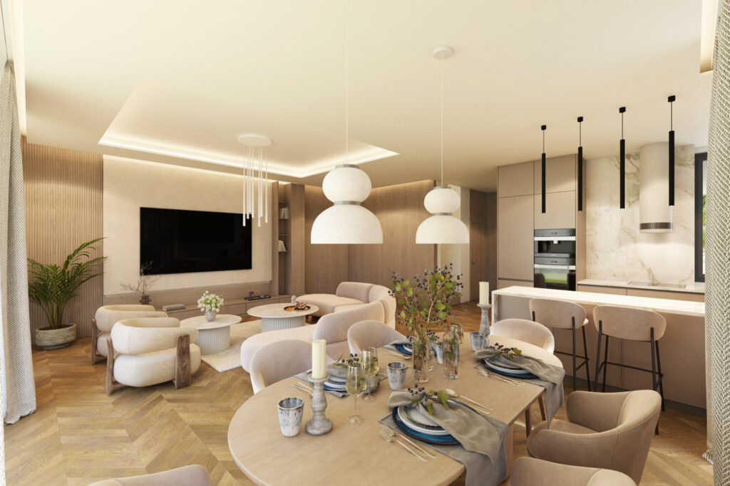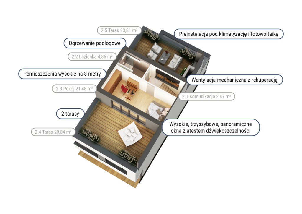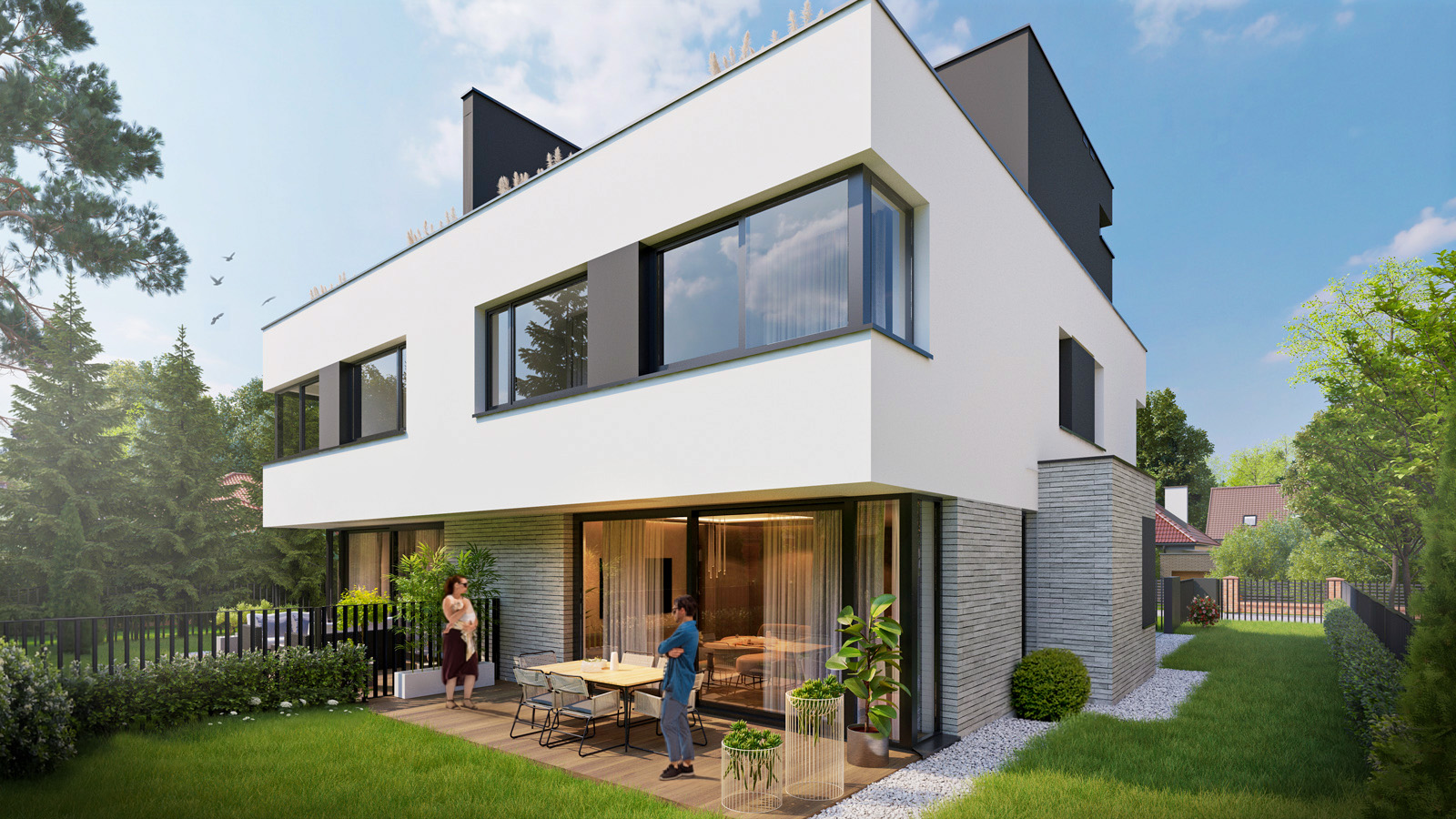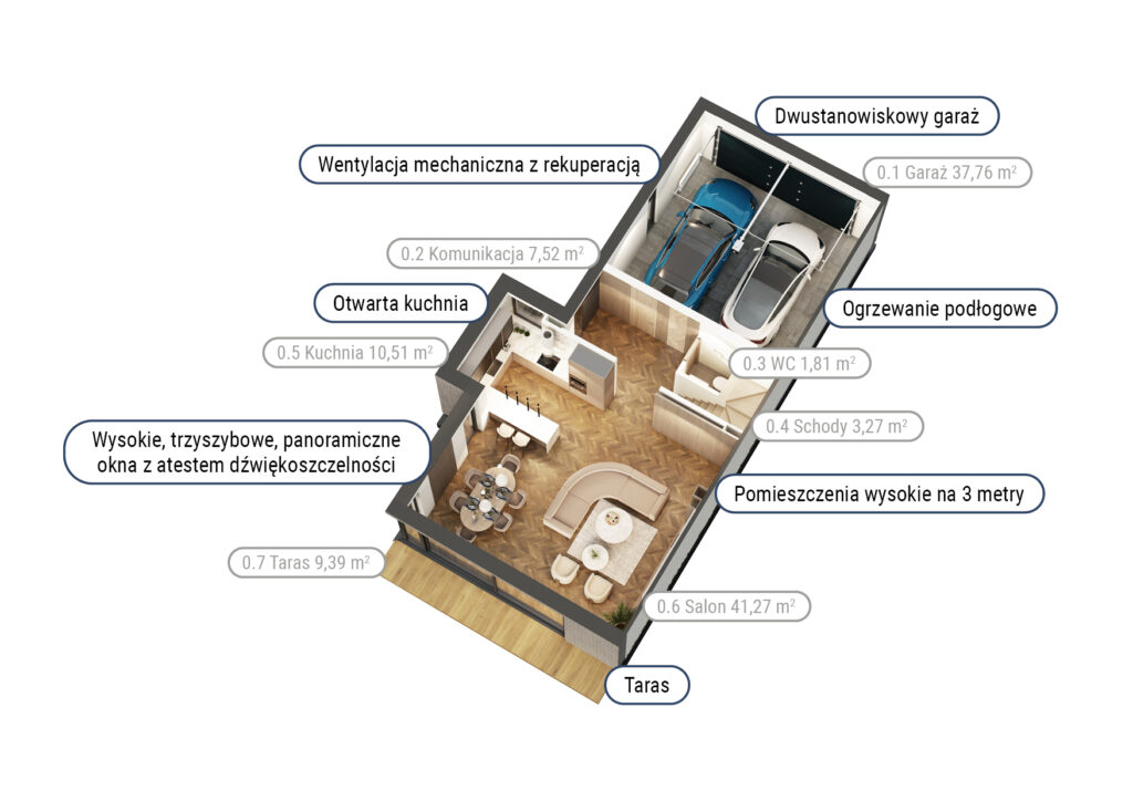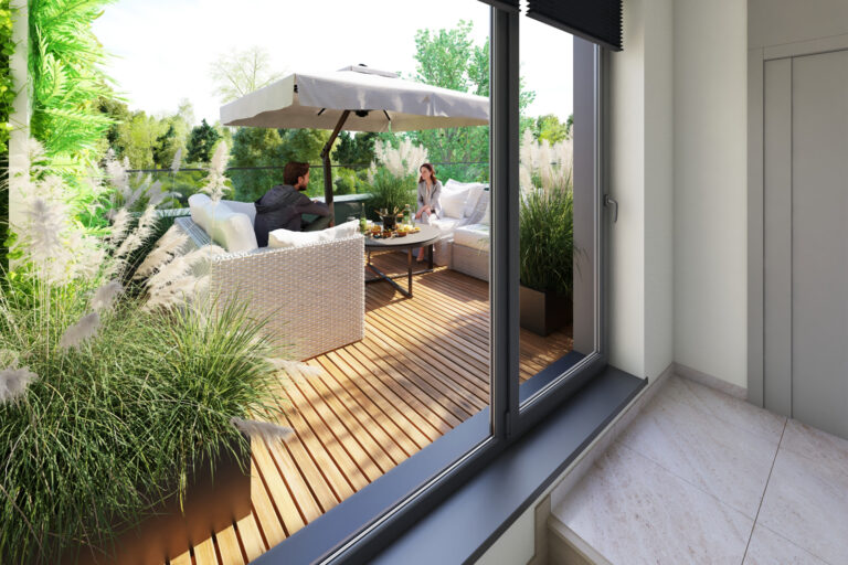 Jeśli lubisz spokojne poranki na świeżym powietrzu lub popołudnia spędzane z rodziną w intymnej atmosferze, w Campi Belli Due znajdziesz idealne warunki. Z salonu wyjdziesz bezpośrednio do prywatnego ogrodu przez duże okno tarasowe w systemie HS, które pięknie doświetla wnętrze. Na najwyższej kondygnacji czekają dwa tarasy z ekspozycją na różne strony świata – doskonałe miejsce na popołudniowe odprężenie, jogę o świcie albo letnie kolacje pod niebem Ursynowa. To właśnie te przestrzenie tworzą atmosferę luksusowego domu, do którego chce się wracać.