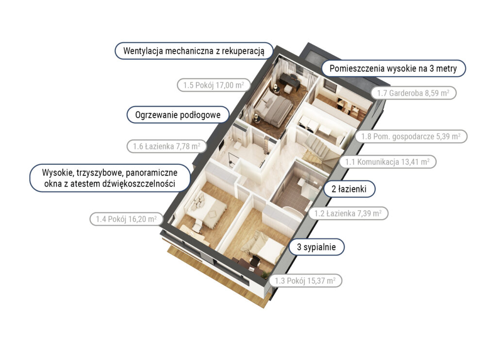 W Campi Belli Due technologia naturalnie łączy się z komfortem codziennego życia. Rekuperacja zapewnia świeże, przyjemne powietrze niezależnie od pogody, a ogrzewanie podłogowe zasilane piecem gazowym dba o przytulne ciepło w każdym pomieszczeniu. Preinstalacja pod klimatyzację i fotowoltaikę daje swobodę wprowadzania nowoczesnych rozwiązań, które obniżają koszty oraz zwiększają wygodę. Z kolei instalacja alarmowa zapewnia poczucia bezpieczeństwa. To dom, który jest funkcjonalny jak nowoczesna willa i przy tym pełen doskonałego stylu.